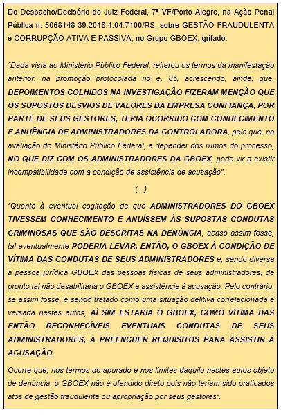 "Quanto à eventual cogitação de que administradores do GBOEX tivessem conhecimento e anuíssem às supostas condutas criminosas que são descritas na denúncia, acaso assim fosse, tal eventualmente poderia levar, então, o GBOEX à condição de vítima das condutas de seus administradores e, sendo diversa a pessoa jurídica GBOEX das pessoas físicas de seus administradores, de pronto tal não desabilitaria o GBOEX à assistência à acusação. Pelo contrário, se assim fosse, e sendo tratado como uma situação delitiva correlacionada e versada nestes autos, aí sim estaria o GBOEX, como vítima das então reconhecíveis eventuais condutas de seus administradores, a preencher requisitos para assistir à acusação". (in Despacho/Decisão, 7ª Vara Federal / Porto Alegre, Ação Penal n. 5068148-39.2018.4.04.7100/RS, 09/5/2019)